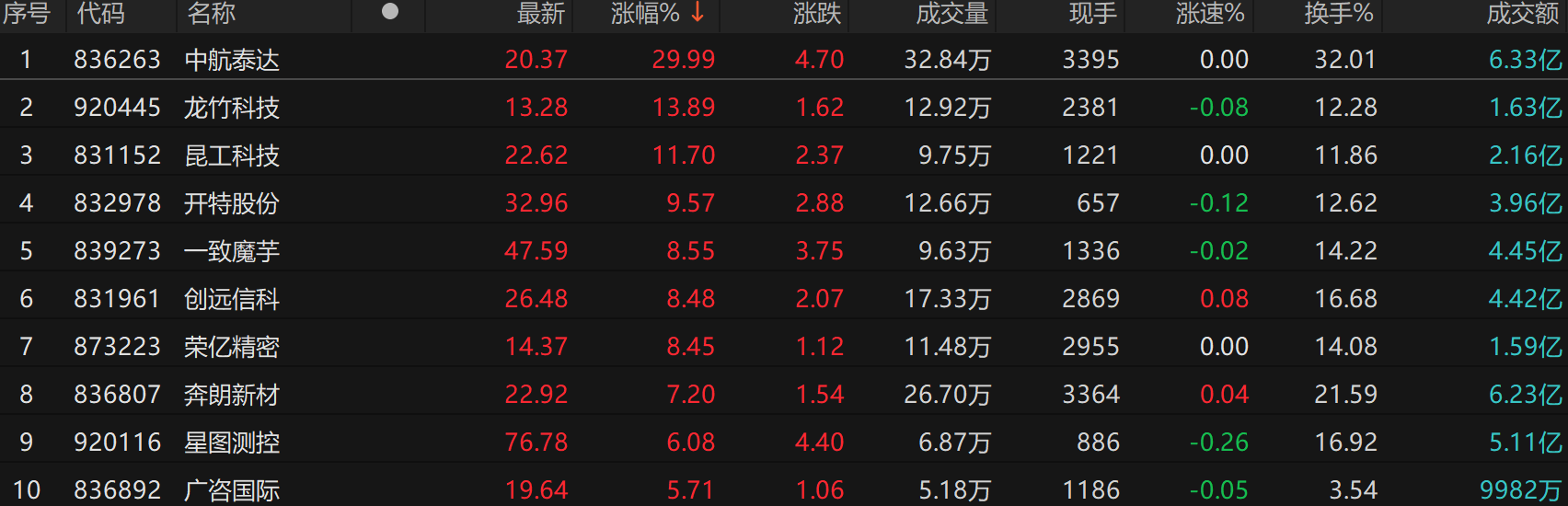 涨幅排行方面,中航泰达涨29.99%居首,龙竹科技涨13.89%次之。