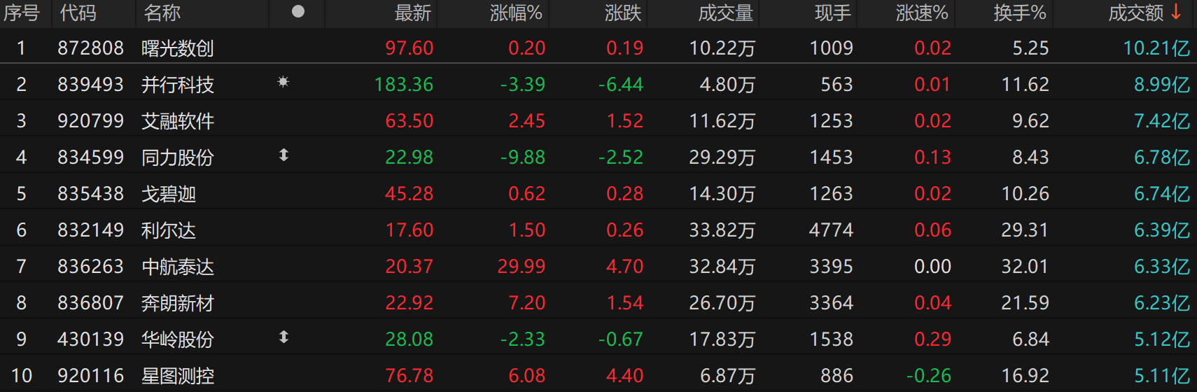 成交额方面,北交所全天共成交365.55亿元,曙光数创(872808)成交10.21亿元居首,并行科技(839493)成交8.99亿元次之。