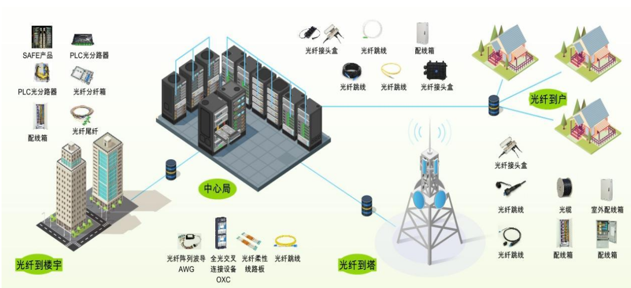 公司产品类别丰富,应用场景多样,能够满足不同客户从分支光缆接入到机房内部布线规划、机房内部线缆与器件、模块、设备间的连接需求,实现终端客户机房从规划、建设到使用管理等各个环节的应用,解决客户通信网络建设过程中不同厂商器件间的适配问题。