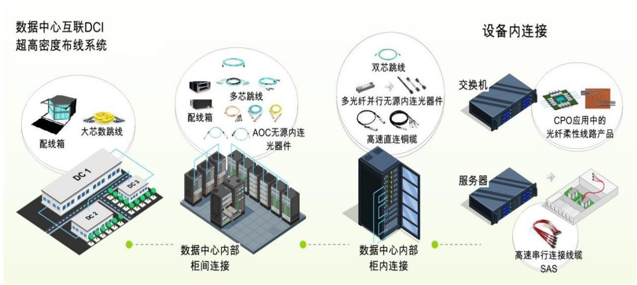公司产品应用场景包括数据中心(包括AI数据中心)与电信领域。2022年至2025年H1,公司主营业务收入中超过80%来源于数据中心(包括AI数据中心)领域,在无源光器件产品特别是高密度、高速率产品竞争力方面市场地位突出。在无源光纤布线产品方面,公司可生产超大芯数光纤预端接布线总成产品,能够满足AI数据中心互连的高密度布线需求;公司开发的高密度无源光纤柔性线路产品密度最大可达2000余芯,布线损耗低于0.1dB,主要用于连接超级计算机或设备内连。在无源内连光器件产品方面,公司应用于400G、800G光模块的无源内连光器件产品已实现大批量出货,1.6T产品已实现少量出货,已开发CPO无源内连光器件系列产品。