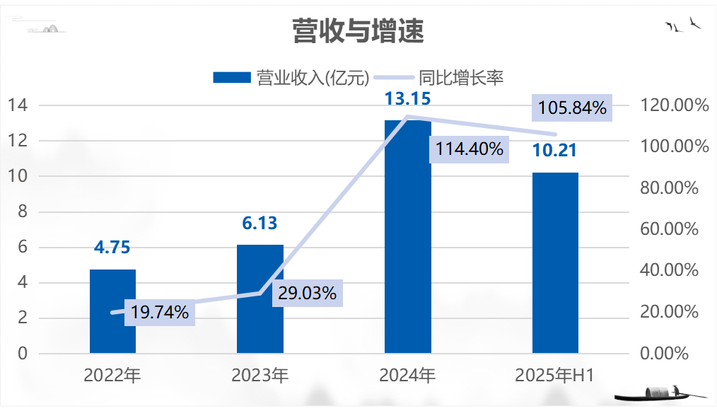 业绩方面,2022年-2024年公司营收分别为4.75亿元、6.13亿元和13.15亿元,CAGR达66.39%;2025年H1,公司营收为10.21亿元,与上年同期相比增长105.84%。