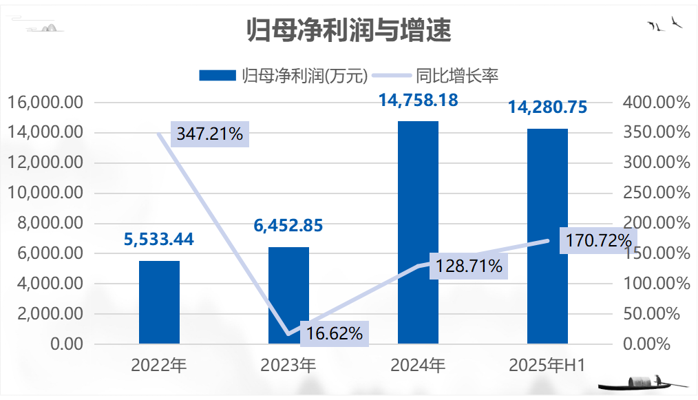 从归母净利润来看,公司归母净利润从2022年的5533.44万元增长至2024年的14758.18万元,CAGR达63.31%;2025年H1,公司归母净利润为14280.75万元,与上年同期相比增长170.72%。