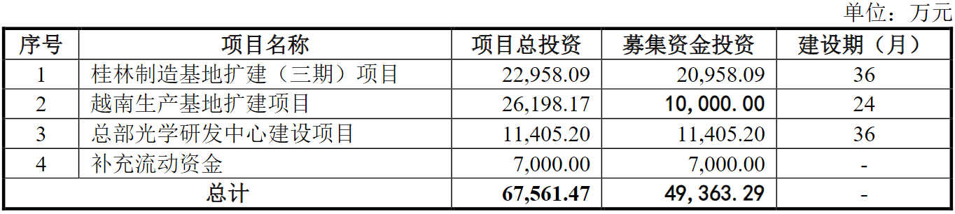 IPO募投方面,本次拟募集资金4.94亿元用于桂林制造基地扩建(三期)项目、越南生产基地扩建项目、总部光学研发中心建设项目和补充流动资金。