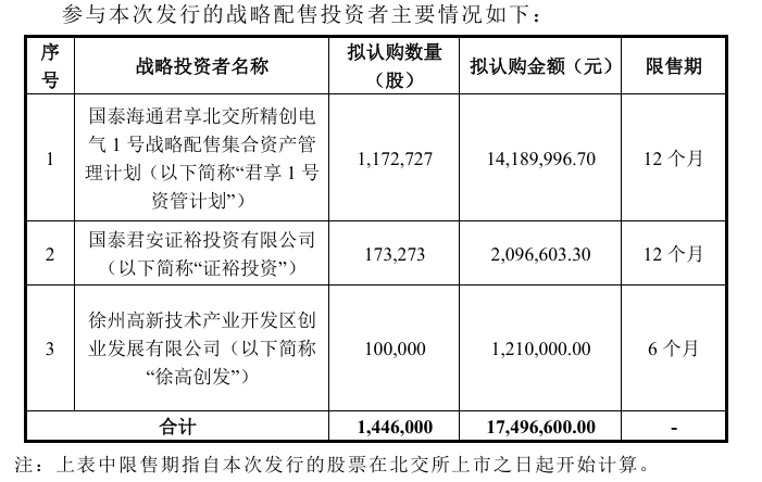 海牛投研11月14日,精创电气(920035)北交所IPO战投名单出炉,引入国泰海通君享北交所精创电气1号战略配售集合资产管理计划、国泰君安证裕投资有限公司、徐州高新技术产业开发区创业发展有限公司3家战投共拟认购144.6万股。