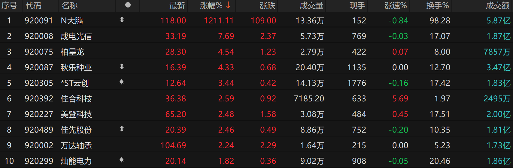 涨幅排行方面,N大鹏涨1211.11%居首,成电光信(920008)涨7.69%次之。