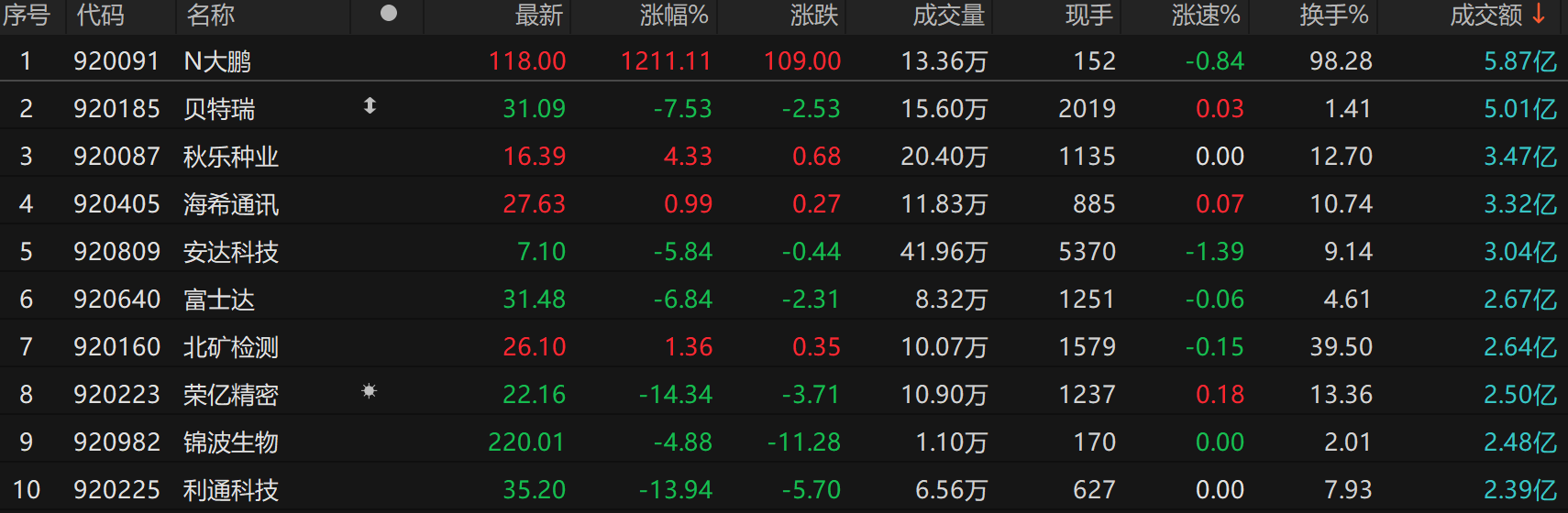 成交额方面,北交所全天共成交173.17亿元,N大鹏成交5.87亿元居首,贝特瑞(920185)成交5.01亿元次之。