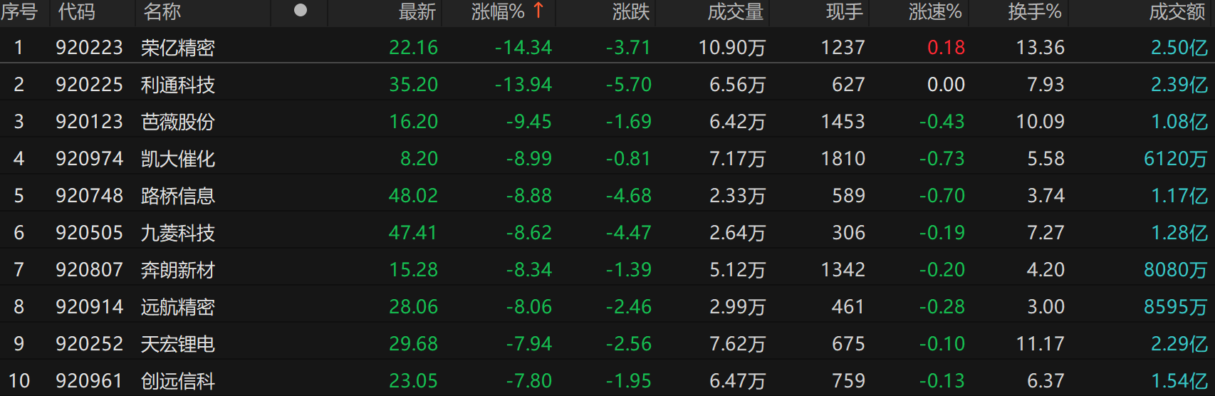 跌幅排行方面,荣亿精密跌14.34%居首,利通科技跌13.94%次之。