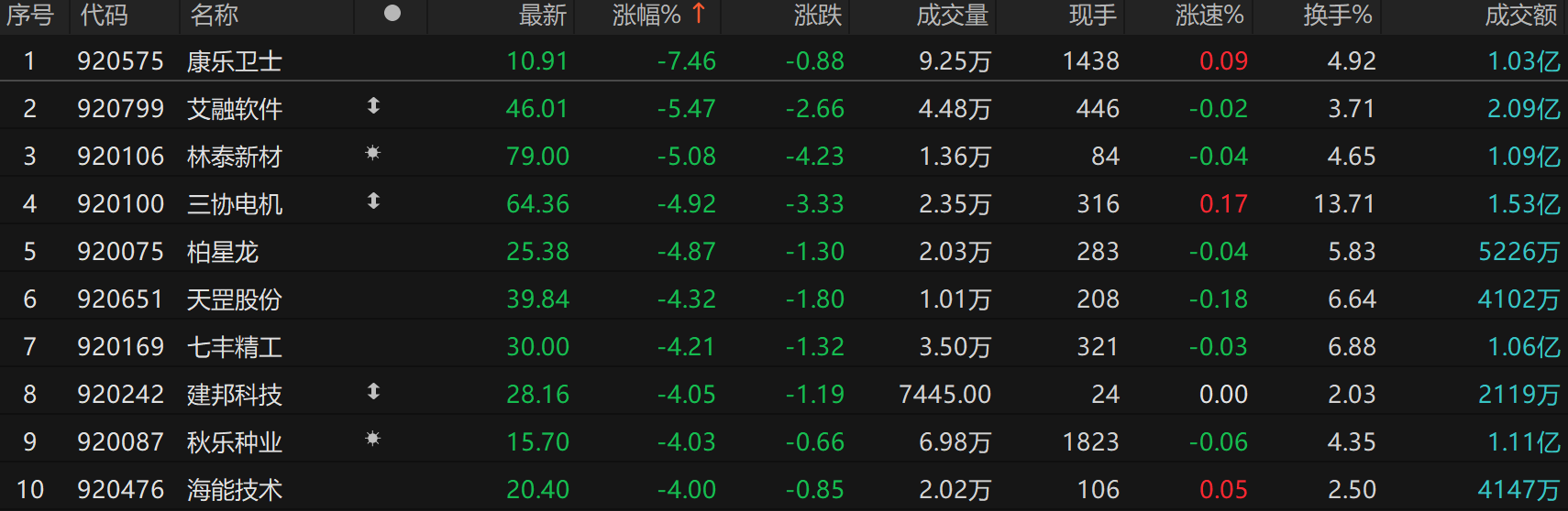 跌幅排行方面,康乐卫士跌7.46%居首,艾融软件(920799)跌5.47%次之。