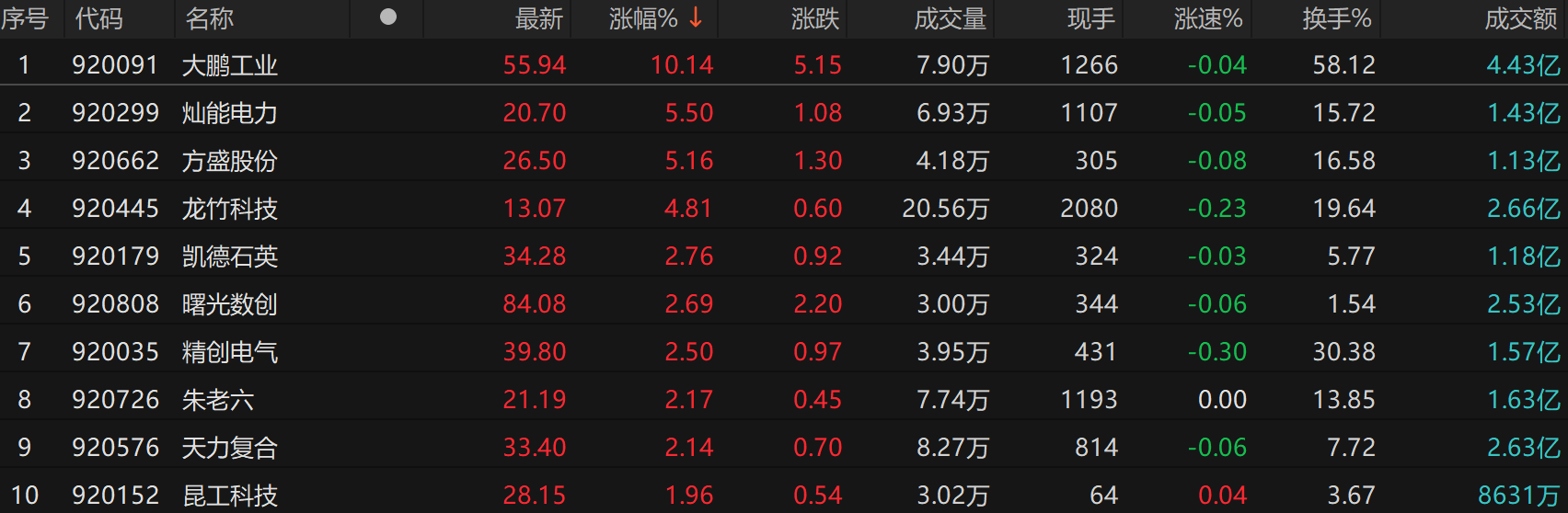 涨幅排行方面,大鹏工业涨10.14%居首,灿能电力(920299)涨5.50%次之。