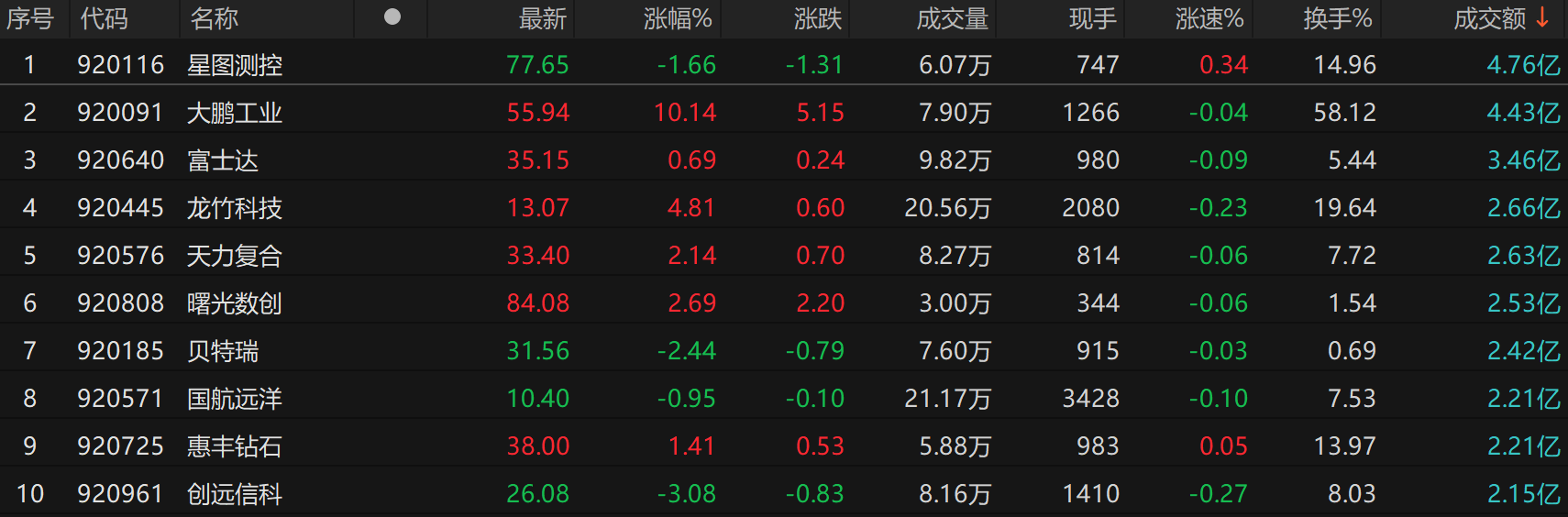 成交额方面,北交所全天共成交139.16亿元,星图测控(920116)成交4.76亿元居首,大鹏工业成交4.43亿元次之。