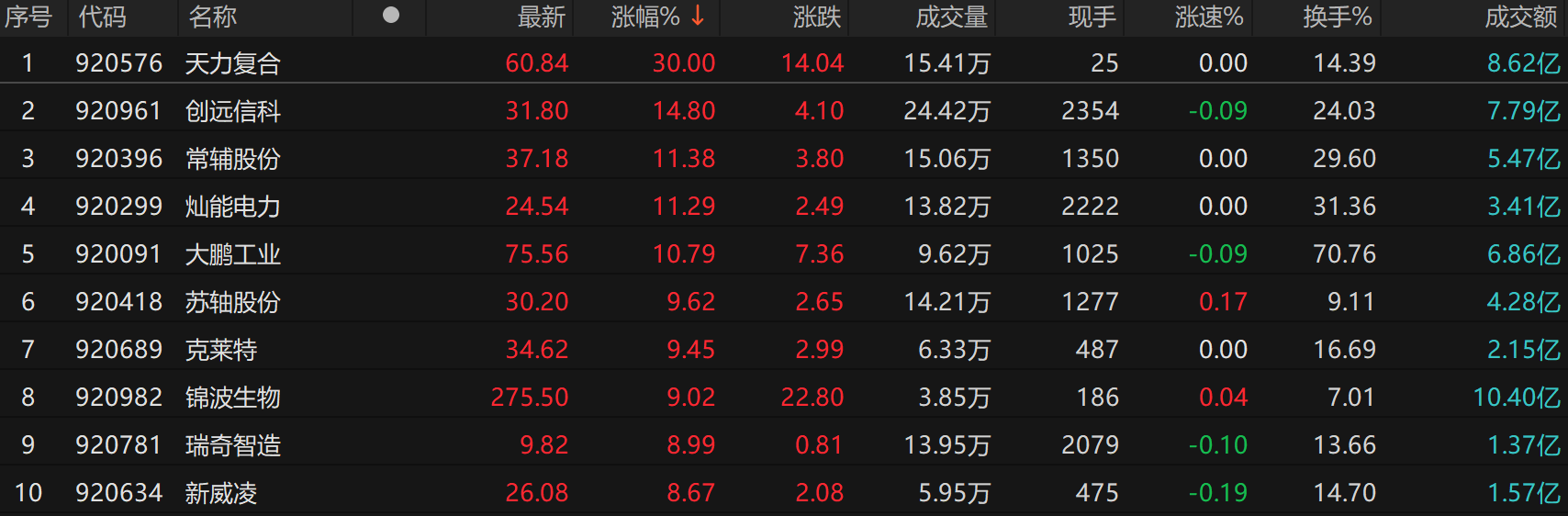 涨幅排行方面,天力复合涨30.00%居首,创远信科涨14.80%次之。