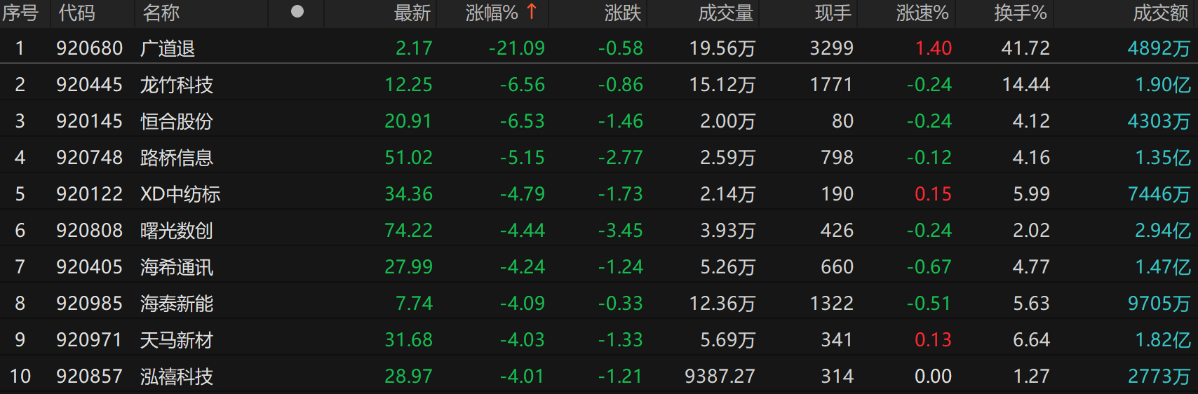 跌幅排行方面,广道退(920680)跌21.09%居首,龙竹科技(920445)跌6.56%次之。