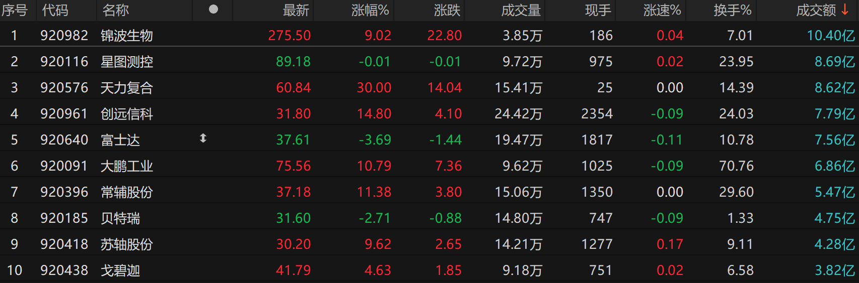 成交额方面,北交所全天共成交269.45亿元,锦波生物(920982)成交10.40亿元居首,星图测控(920116)成交8.69亿元次之。