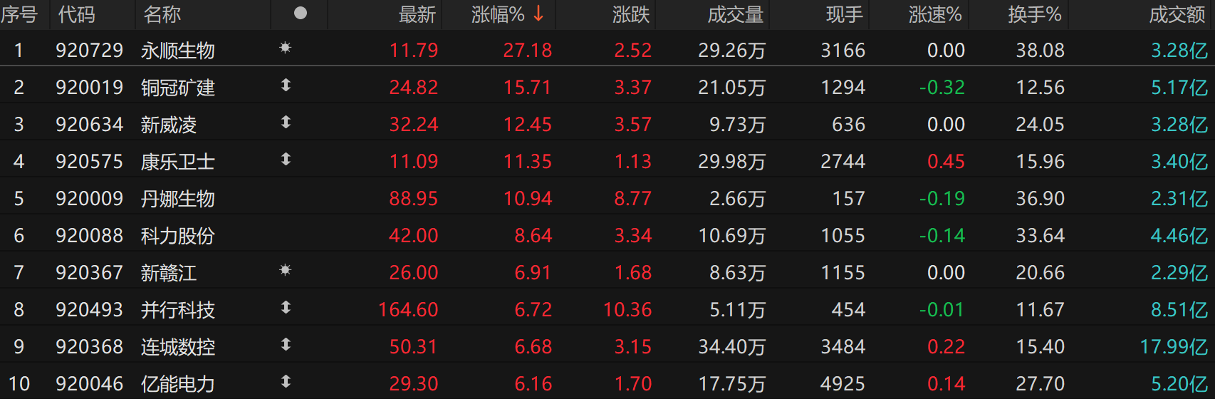 涨幅排行方面,永顺生物涨27.18%居首,铜冠矿建(920019)涨15.71%次之。