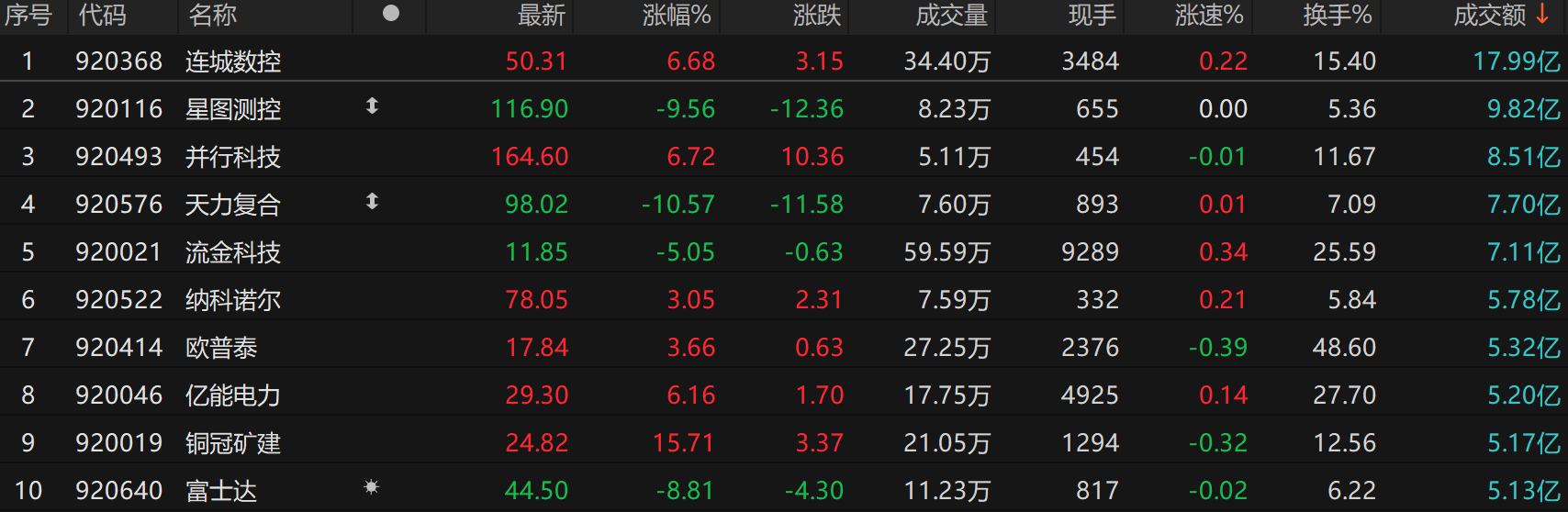 成交额方面,北交所全天共成交328.13亿元,连城数控(920368)成交17.99亿元居首,星图测控成交9.82亿元次之。
