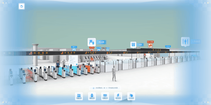 针对安检口开通情况、人体扫描仪器监管和行李 X 光机监管等设备动态逐一渲染复现。同时,它还深度集成了电力、环境、电能质量等监控系统,并联动后台接入真实数据,通过颜色和动效来感知设备的作业状态。这使得运维人员能够及时了解设备故障情况,并根据安检人员数量来合理开通通道,避免对旅客造成延误或等待时间过长等不友好影响。