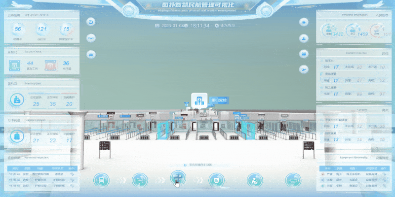 智慧航站楼基于空间、时间、指标等多维度数据,以多样化组态图表对航站楼目标因素运行数据进行图形化和可视化。数据动态加载的面板形式呈现于场景两侧,使工作人员可以宏观地监控航站楼内旅客大厅、安检大厅、行李转盘、安检、边检查验、海关等多个因素的运营状况。