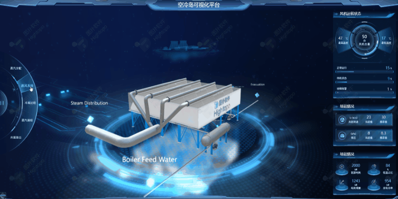 环保、低碳将成为今后几十年世界的主导产业。图扑软基于诸多智慧电厂可视化项目实施,依托自主研发的HT引擎,营造空冷岛设备运行场景,通过数据加动画的形式展示空冷岛的运行效果,环环相扣,融合 2D、3D 可视化技术实现空冷岛全流程的运行动画展示。