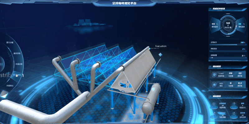 冷凝过程是指运行过程中,热蒸汽进入空冷岛冷凝,冷凝后形成的冷凝水进入凝结水收集联箱储存。冷凝过程可视化通过风机转动气流,冷热气体交替动画效果,水滴冷凝收集效果等直观展示,辅助颜色效果,数据面板等内容对整个冷凝过程的加以理解和说明,生动展示整合过程。