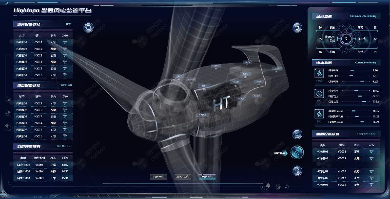 图扑 HT 构建了面向大型风力发电机管理的数字孪生系统,包括在线监测、消防监测和生产监测三大监测模块。通过提供风机全生命周期的可视化管理解决方案,帮助客户降低成本,提升管理效率。