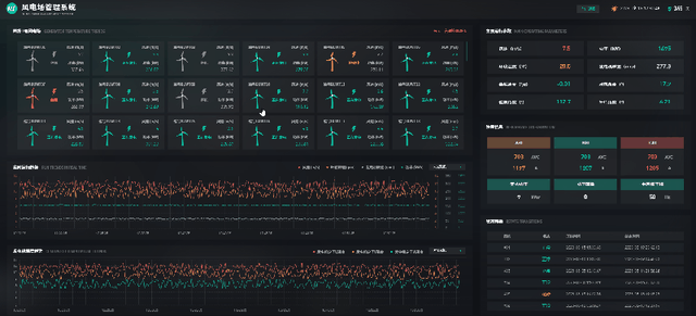 在数据看板层面,主要监视风机运行状态统计、实时风速与功率运行趋势曲线。会详细显示风机矩阵的主要运行参数、实时状态数据、涉网信息、状态变更历史信息、实时运行趋势曲线以及发电机温度趋势曲线数据。