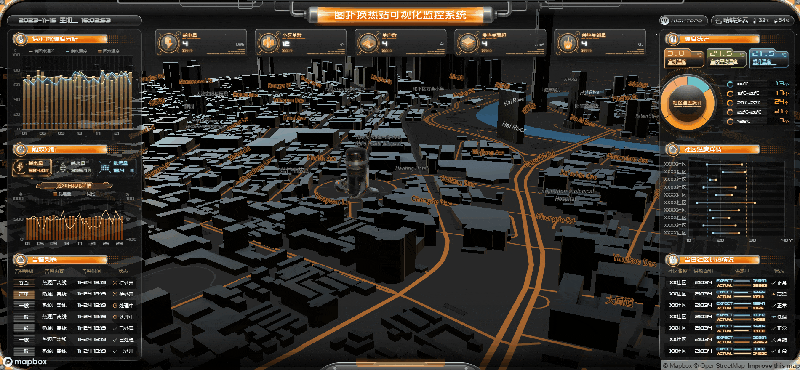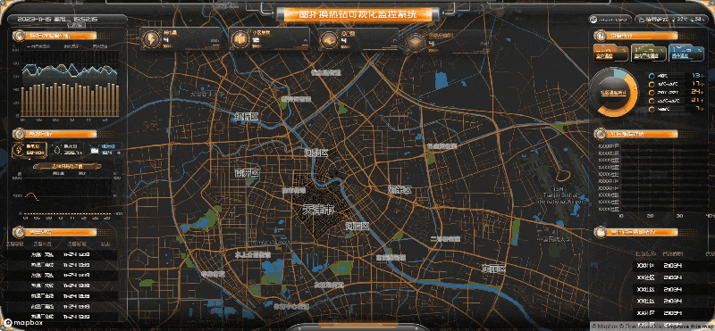 初始页面场景以天津实际地图为背景,基于图扑 HT for Web GIS 技术,对换热站的三维标识进行手工建模,生成城市路网布局。结合物联网、人工智能、大数据等新 ICT 技术进行数据聚合和统计计算,以统计图表和图形形式展示在页面和场景上。图扑 HT 换热站可视化系统通过高亮渲染,在 GIS 底图上呈现出换热站社区供热范围。