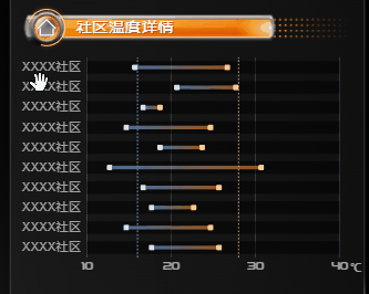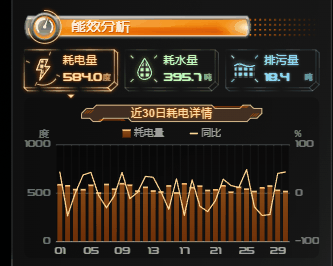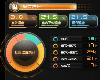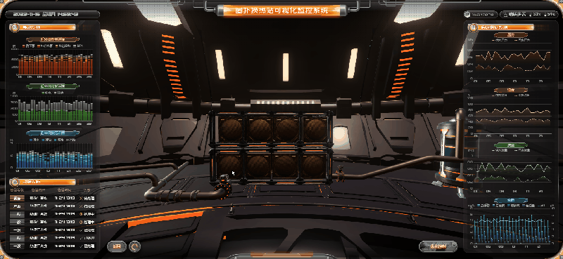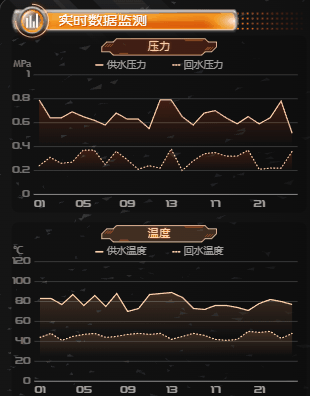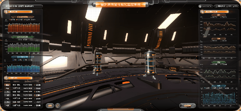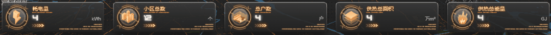场景两侧 2D 面板整合社区供热量明细,重点展示设备温度、能效、告警等关键信息。通过供热量的明细展示,社区可深入了解供热需求,包括不同时间段的峰谷值和社区热负荷差异。也有助于居民和管理者更好地了解热能使用情况,优化供热系统运行。同时,鼓励居民参与节能环保,采取措施减少环境影响,提高能源利用效率。