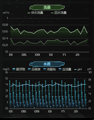 图扑 HT 可视化系统中,通过三维模型绑定物联数据,结合水位信号实现自动补水,满足系统的水量使用要求。可通过 2D 弹窗查看 pH 值、浊度、溶解氧含量、供水压力、温度等参数变化,以及水位补水情况的三维实时动画。