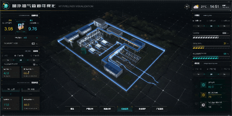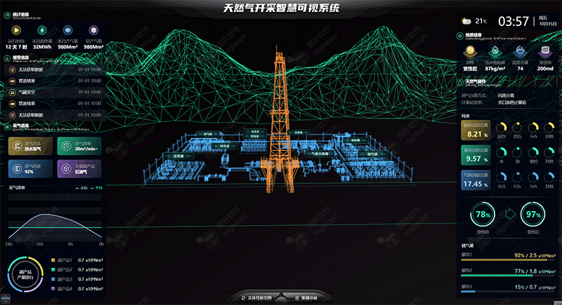 智慧天然气开采界面实现可交互式的三维场景,场景内进行缩放、平移、旋转。两侧 2D 面板接入实时数据,展示天然气产量、设备故障信息、采气纯度、采气效率、天然气存量等信息。界面底部的切换按钮可查看气田的线框状态。