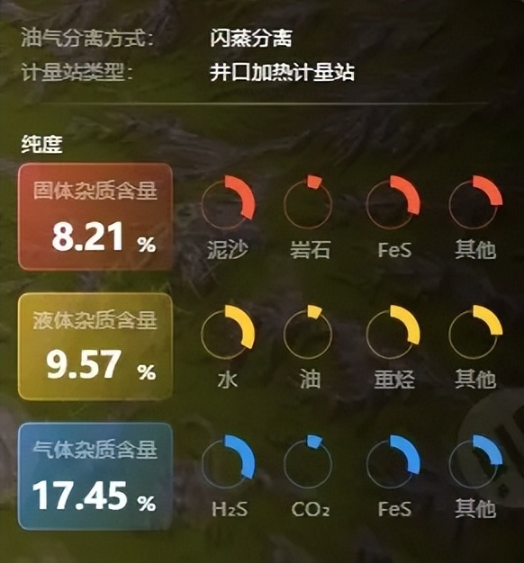 天然气储存:用饼图的形式直观表达开采纯度,如固体杂质含量、液体杂质含量、气体杂质含量。
