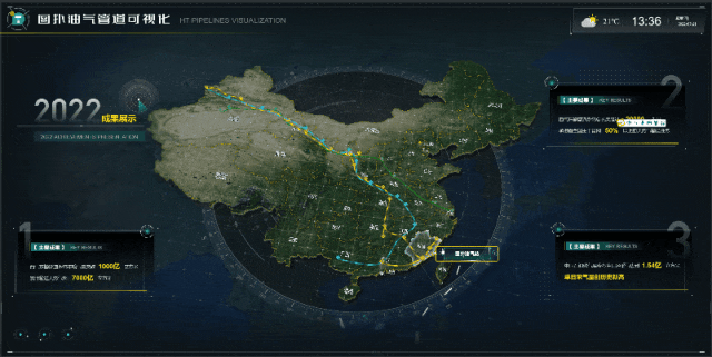 该案例通过图扑软件 HT 可视化打造油气管道运输三维监控页面。初始进入场景,首页选用 2022 年西气东输主要成果进行展示,通过生成二维数据看板,以简洁直观的方式呈现关键数据。