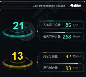 分输量:将省管网分输量、指定分输量以及昆仑分输量进行可视化表达,用户可根据 2D 面板直观查看输送量具体数据以及占比情况,实现了分输监测由人工主导向智能控制的转变。