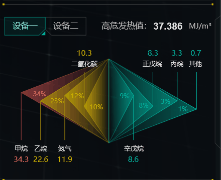 气体组分信息可视化:支持对不同设备的气体组分进行监测,包括甲烷、氮气、CO₂ 等气体所占比例,点击对应设备即可切换查看,实时掌控设备的运行健康状态。