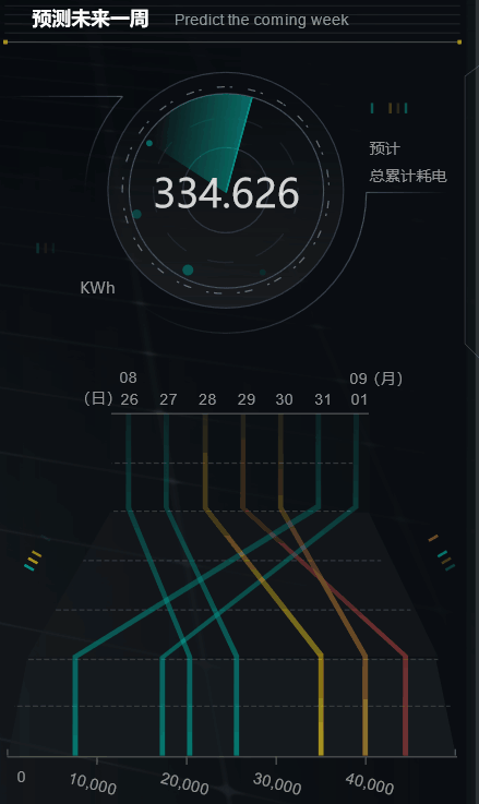 对油气站而言,提高运营管理水平,降低运行能耗,是降低企业输油成本、提高经济效益的重要手段。图扑软件利用 HT 产品丰富的图表、图形设计元素将总耗电以及压缩机耗电进行可视化表达,并根据输送方案,对油气管道未来一周的能耗进行预测,可有效查看机组能耗,提高能源利用效率。