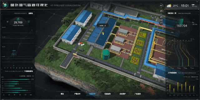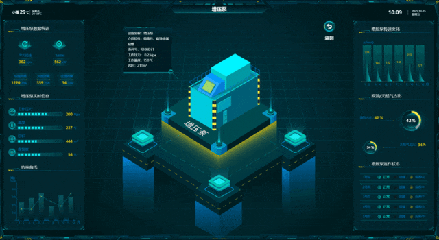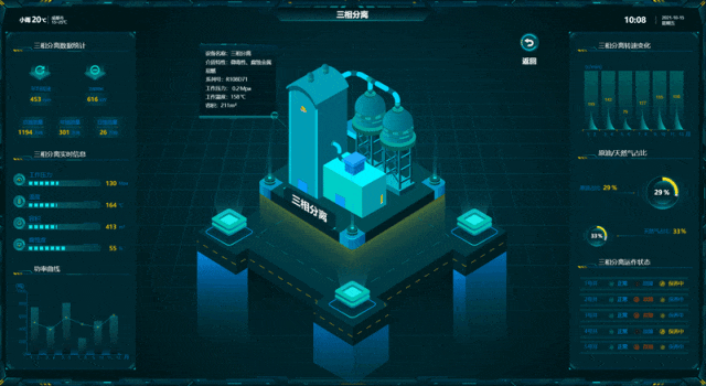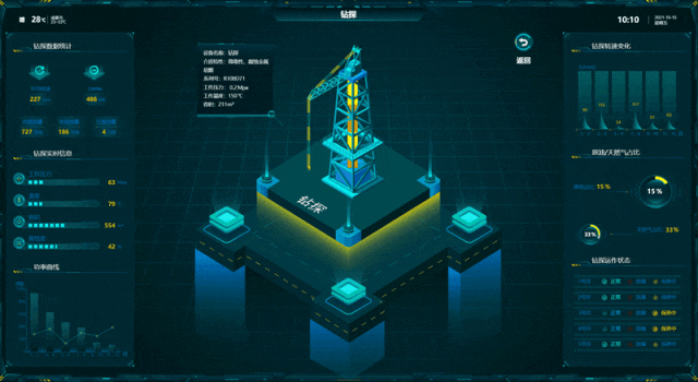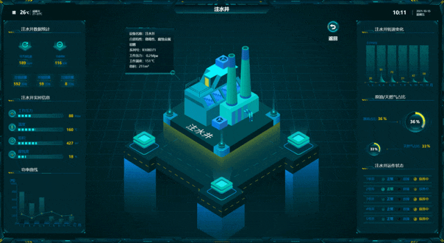 图扑软件曾采使用 2.5D 组态设计形式搭建过智慧油田大屏,深入展示油田生产过程中各项业务的工艺流程,以及分析设备性能、生产状态等相关指标。用这种数字化和智能化的管理方式,保障生产的安全与高效。
