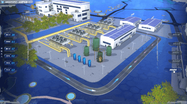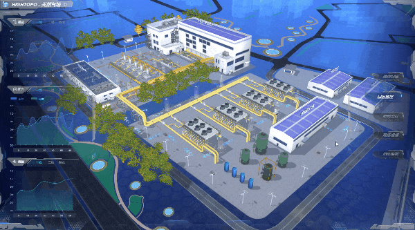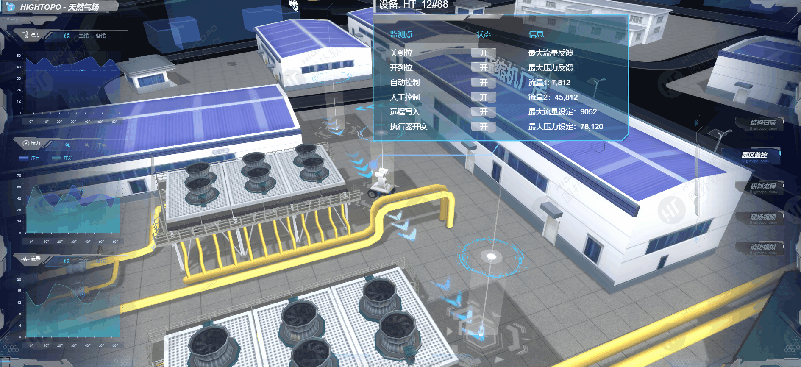 图扑 HT 轻量化建模方式搭建的天然气站解决方案,支持针对能源安全方面着重监控管理,通过园区/设备实时监控、智能预警系统,帮助用户快速识别和应对潜在风险,有效保障天然气站的安全运营。