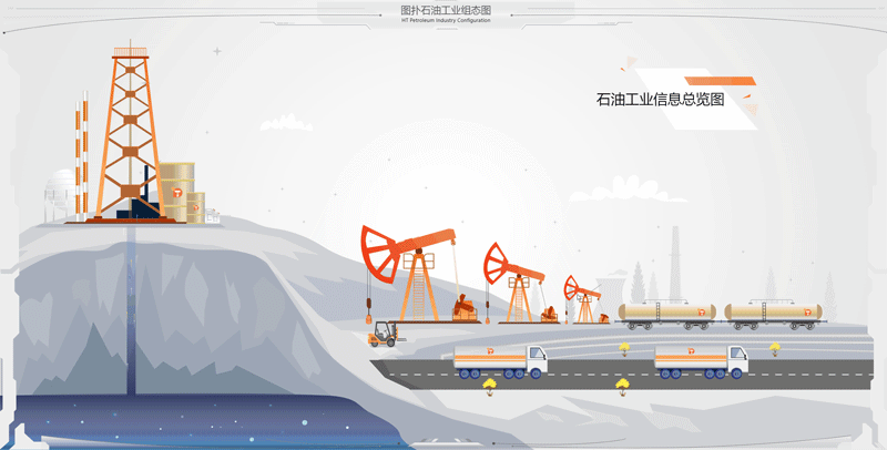该石油工业可视化案例选用扁平插画风格来展现,使画面更加简洁明快,突出展示了石油化工业务的关键要点。