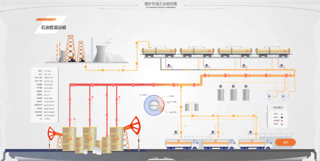 石油管道运输系统围绕输油管线、输油站以及油罐车以及成分参数进行 2D 可视化动态展示。动态监测的主要包括油井的液位、水位、可容量、可发量、油温度、油质量等参数属性,以及油品占比及当日储罐动态、当日发货动态的收发油量等数据。同步显示石油管道车开关状态、综合报警、超扭矩等信息。