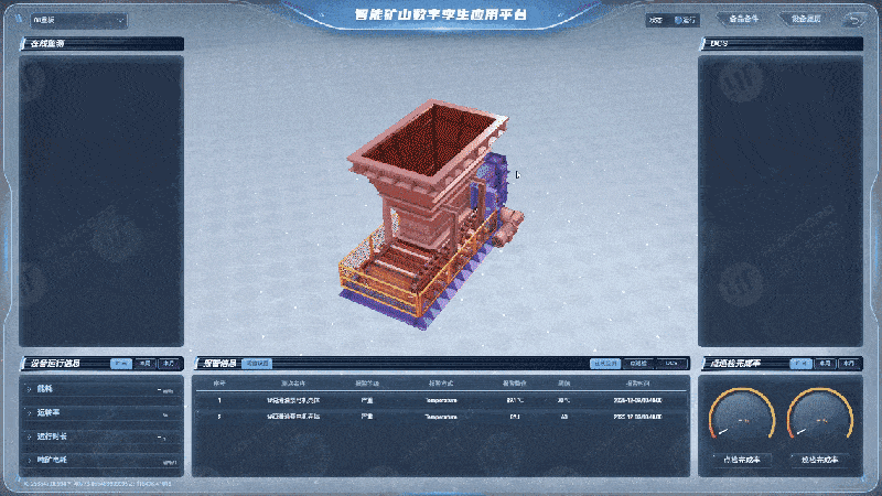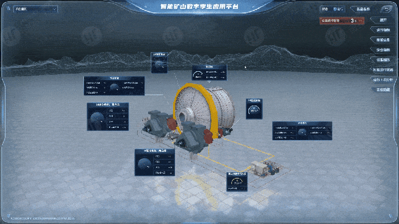 该场景覆盖全矿区设备的智能化管理体系。模块对 10 类 31 台关键生产设备进行 L5 级精细化建模,对 124 台其他生产设备完成设备级建模。场景内搭配图扑 HT 丰富的 2D 图形组件,实时呈现出设备运行参数、启停状态、预警报警信息,并具备备品备件到期自动预警、设备履历全生命周期追溯、多维度报警统计、运行指标实时统计等功能,为设备运维培训、故障排查、精准管控提供全方位支撑。