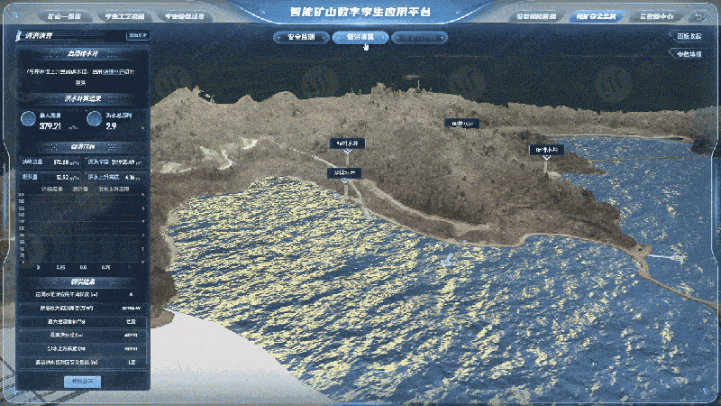 启动计算后,系统通过内置专业计算模型,自动完成洪水过程线计算及调洪演算,同时以 3D 动画清晰展示库区地形、水位上升等实时变化,实现动态水位变化和洪水演进的可视化模拟。演算结果可精准分析现有排洪设施的安全性能,确保尾矿库的洪水应对能力符合设计要求,全面提升极端天气下的库区安全保障水平。