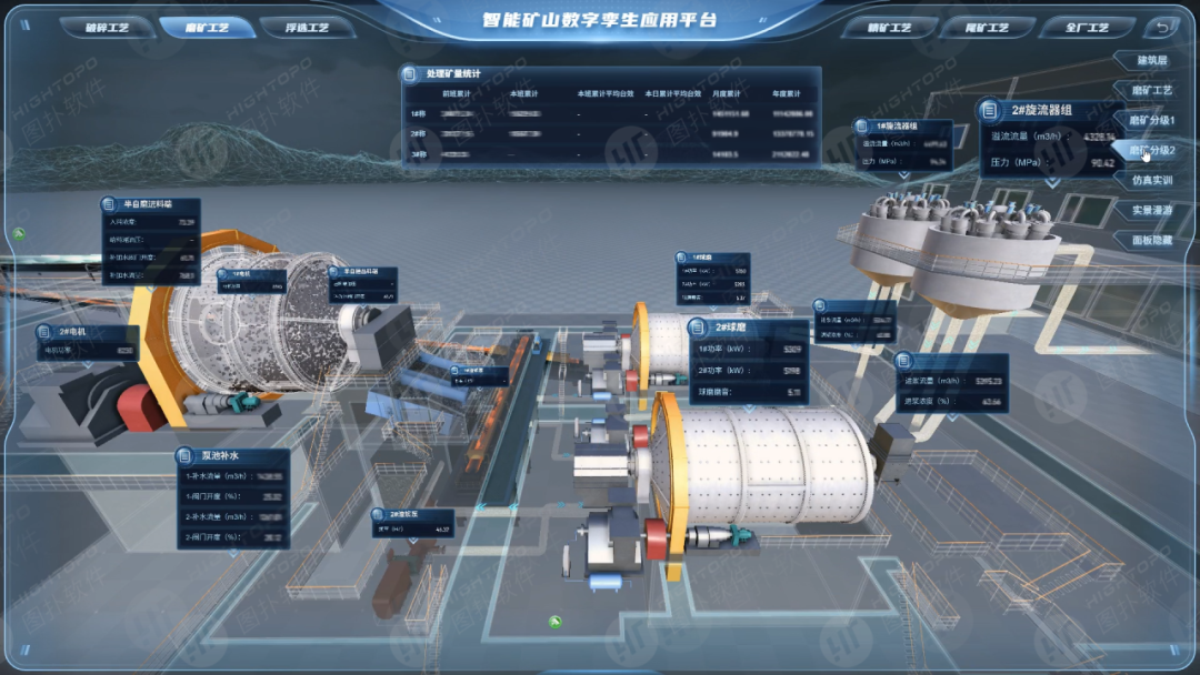 磨矿工艺作为破碎工艺的后续延伸,依托图扑HT数字孪生技术,实现粗矿堆、半自磨机、球磨机、旋流器等全链路设备布局与物料流向的精准还原,构建全流程实时管控体系。系统支持自动巡检与手动漫游两种模式,用户可沉浸式查看矿石从粗矿堆输送至半自磨机、球磨机进行破碎研磨,再经旋流器分级处理的完整流程,同步联动建筑图层、实时生产数据及关键点位视频监控,动态展示瞬时矿量、累计矿量、仓料位高度等核心工艺参数,以及各设备的运行、停机等状态,异常情况可第一时间触发报警,便于工作人员快速处置。
