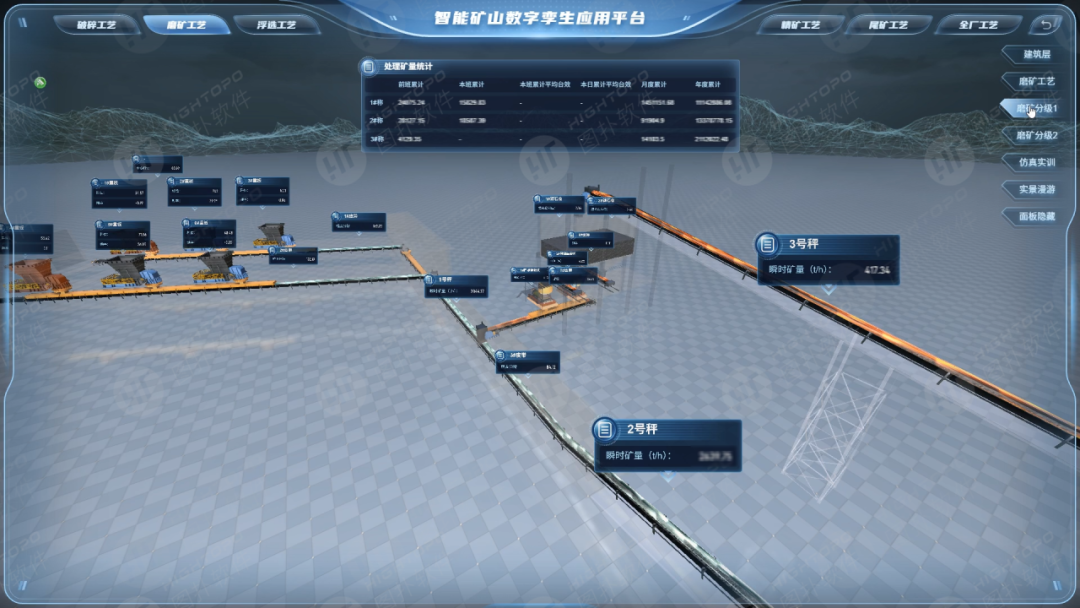 在破碎工艺环节,依托图扑 HT 技术构建全流程透明化管控体系,整合建筑图层、实时生产数据、视频监控及异常报警等多元功能,清晰呈现从矿卡放矿、破碎加工到粗矿堆储存的完整作业链路。通过三维模型精准还原设备实际布局、矿石动态流向及关键工艺参数,实时监测各类设备运行状态,一旦出现异常可快速识别并触发报警提示,保障作业安全。同时,工艺漫游功能打造沉浸式操作体验,支持用户动态追踪矿石处理的每一个环节,可随时调取关键点位实时视频,结合工艺流程同步展示、设备状态联动更新、报警信息及时提醒等功能,确保破碎作业高效有序推进,为后续磨矿工艺提供质量合格的原料支撑。