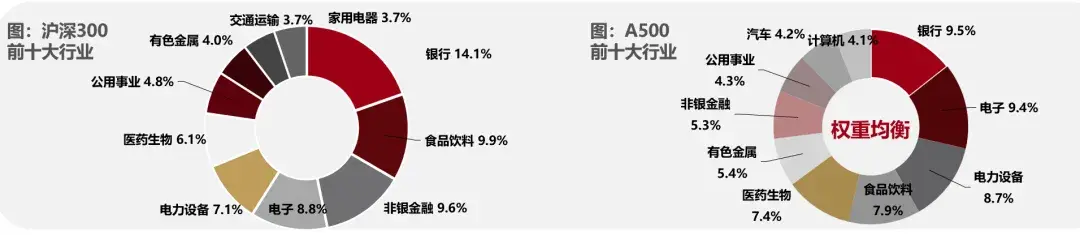 我们来看看中证A500指数和沪深300指数的行业对比图。