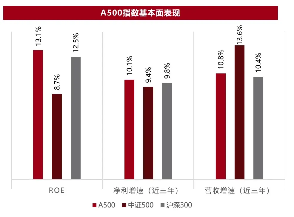 从指数的基本面情况看,根据测算,中证A500指数样本的平均ROE为13.1%,高于沪深300(12.5%)和中证500(8.7%),近三年平均净利润增速也在三者中最高,说明指数样本的盈利能力和成长性要比沪深300和中证500更好。