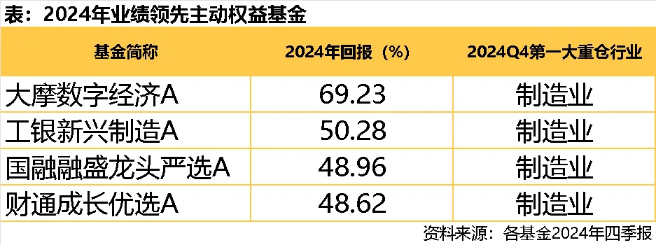 根据中信建投证券的统计,2024年业绩表现领先的高仓位主动权益基金中,多数领先基金都重仓了电子、通信等板块,其中以科技成长类基金经理为主。因电子为制造业的细分领域,故基金四季报披露的第一大重仓行业为制造业。