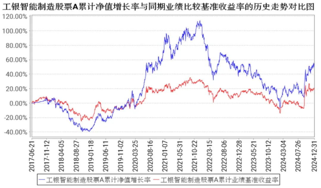 比如,工银新兴制造A在2024年持仓了半导体设备和AI芯片环节,全年累计回报达到50.28%,超越业绩比较基准(11.3%)。