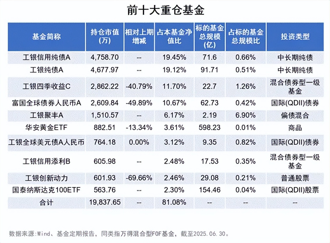 今年一季度,债券利率先上后下,随着债券收益率接近历史低位,性价比进一步下降,工银价值稳健6个月持有混合(FOF)又陆续兑现部分债基收益,增加了信用债和含权债基的配置。(资料来源:2025年基金一季报与基金中报)