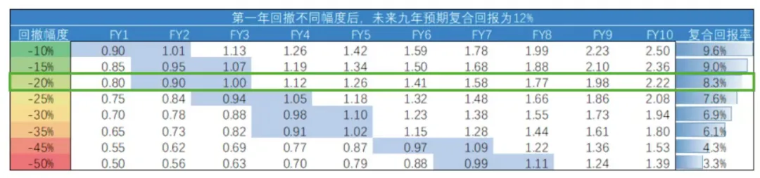在一笔10年的投资中,如果第一年回撤20%,假设未来9年复合回报都是12%,综合下来复合回报只有8.3%;
