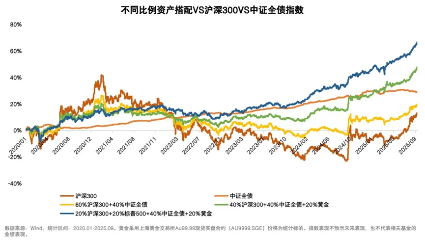 比如图中深蓝色的K线,就是在中证全债的基础上,加入A股、美股和黄金一起搭配。可以发现,这种多资产的组合,就像在固收资产平稳的收益基础上,又把权益资产带来的大幅波动“熨平”了不少,不管是收益表现,还是抗波动水平,都比单一资产表现更胜一筹。