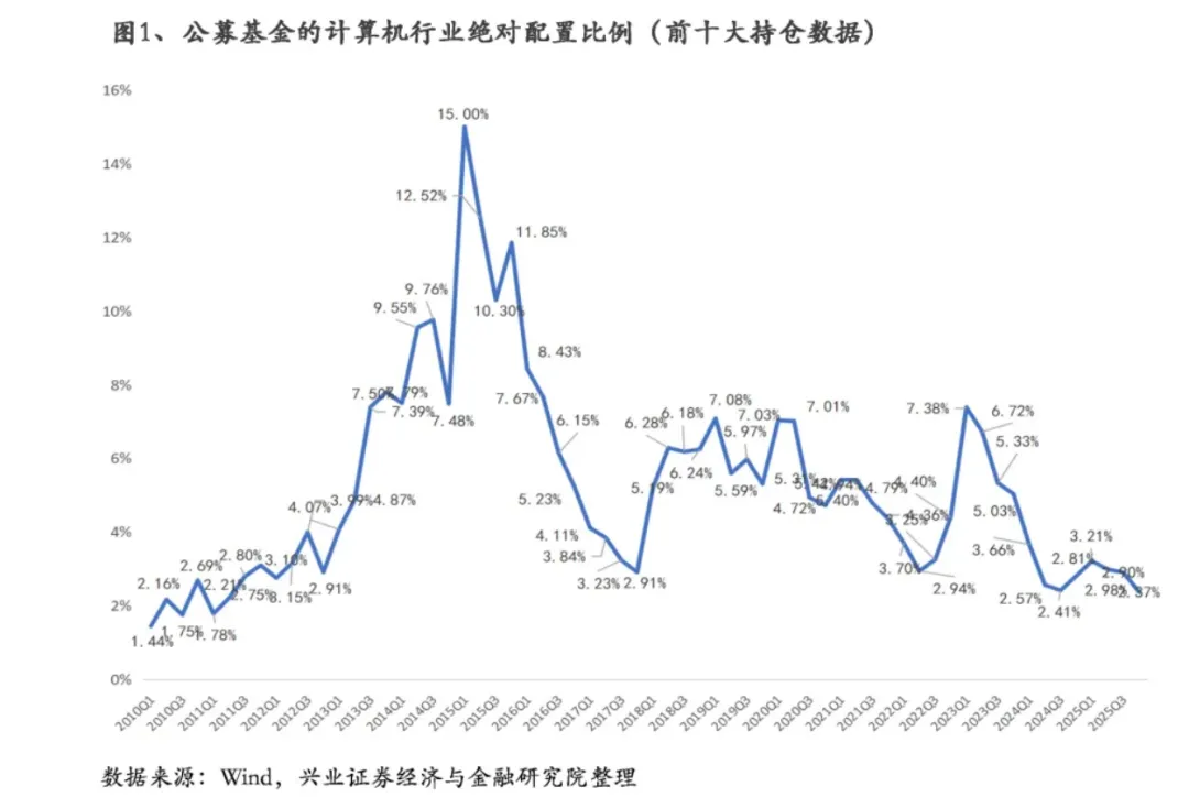 根据兴业证券的统计,截至2025年四季度末,主动公募对计算机行业的配置比例为2.37%,处于低配状态。